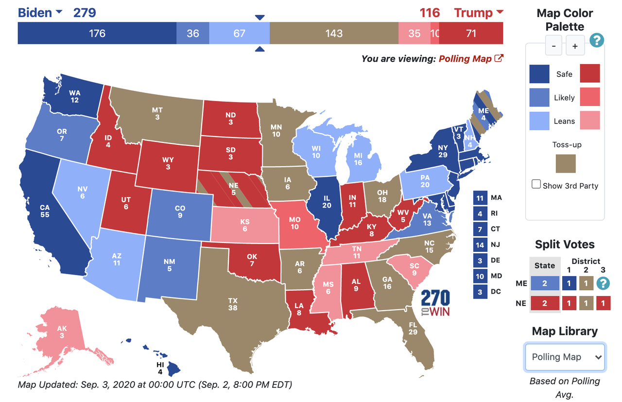 MNミネソタ州は前項のコメントで指摘頂いた通り1980年代から連続で民主党が勝ってるんですけど近年は激戦で過去の勝敗の結果からするほど民主党の強固な地盤ではないです。今回はBLMの発端となった事件が起こったのがミネソタ州なので投票率が上がることが予想され、投票率が上がるということは強固な支持政党を持たない層の投票が増えるため予想が難しいことになります。