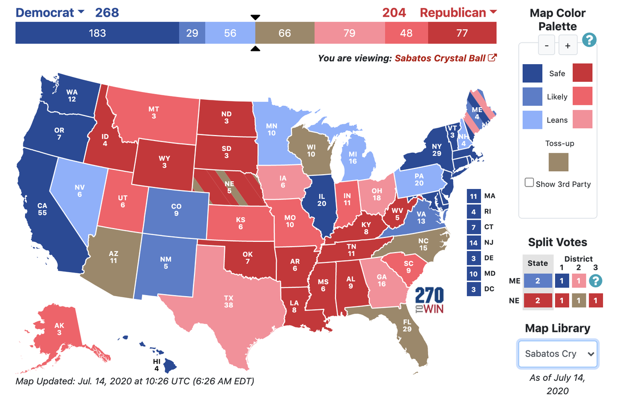 Big Tenのエリアは中央北の水色の多いあたりです。同圏内では西からMNミネソタ州、IAアイオワ州、WIウィスコンシン州、MIミシガン州、OHオハイオ州、PAペンシルベニア州までがこれから2ヶ月で揺れる可能性がある州でしょう。ここの水色州をトランプがいくつかひっくり返えさないと全体で敗戦となります。水色州+カーキー州を丸ごと赤に変えられれば戦況一変です。なぜトランプ陣営がBig Tenを重視するかおわかりになるかと思います。